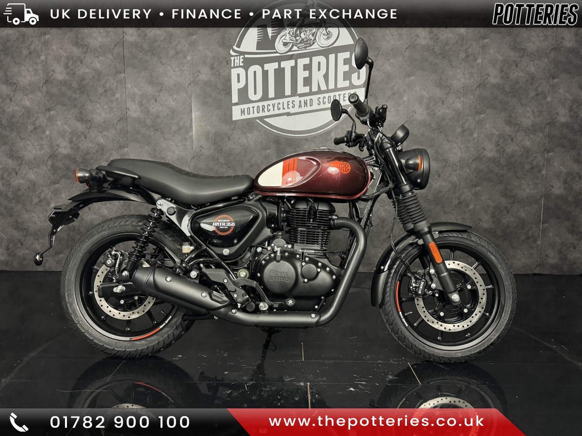 In stock Now!A SHOT OF STYLE. A SHOT OF TORQUE. A SHOT OF FUN. ALL THE INTENSE FLAVOURS OF PURE MOTORCYCLING PACKED INTO A FUN, STYLISH, NEW MACHINE. The HNTRs riderfirst ergonomics, revised rake angle and low centre of gravity have been designed to let you effortlessly manoeuvre the streets of the worlds coolest neighbourhoods. An intuitive throttle response guarantees unprecedented agility with every flick of the wrist. With its shorter wheelbase, lighter weight and tighter geometry, the HNTR's frame is fitted with a super maneuverable set of wheels, a hip retrometro aesthetic and a 350cc Jengine that packs extra muscle for every hustle. The Metro HNTR comes with new age, dualcolour liveries that blend in seamlessly with the worlds coolest neighbourhoods. The Cast alloy wheels, wide tubeless tyres, split aluminium rear grab rails and rounded rear lights. The HNTR 350 loves to run relaxed and she likes to dance between curves. It reminds you of a motorcycle from another time that makes you want to enjoy riding At the heart of the Hunter beats a fuelinjected, longstroke 350cc Jengine that delivers a smoother ride, higher RPM and dollops of torque. Paired with a steady downtube spine frame and grounded suspension, the Hunter 350 gives the right amount of power and precision, whether youre revving up the city streets or gunning down the motorway. Continuing the legend of the easy singles, the new engine throbs with a visceral beat that is distinctively Royal Enfield.Nationwide delivery available.Part exchange welcome and finance can be arranged over the phone or in store.Over 300 New and used bikes in store at our huge 20000 square foot showroom based in Stoke on Trent just off junction 15 or 16 of the M6.Buying from a distance? Ask for a detailed video walkaround via WhatsApp on 07594817630 so you can inspect the bike before purchase.01782 900100 or infothepotteries.co.ukWe offer home delivery with a 7day distanceselling return period, in line with the Consumer Rights Act.Returns must be as delivered, in the same condition as supplied, and with no additional mileage. Delivery charges are nonrefundable, and return transport costs are the buyers responsibility.