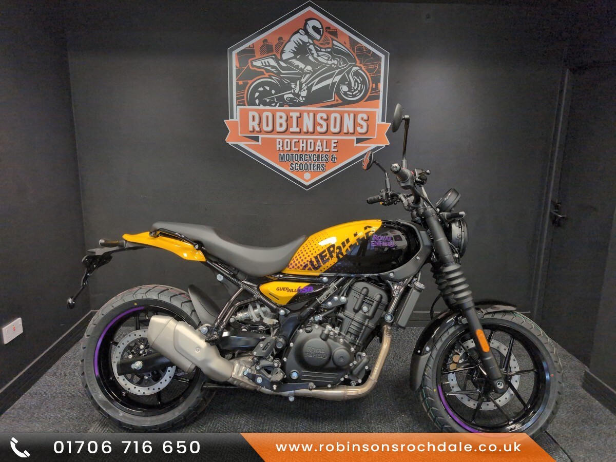 ROYAL ENFIELD GUERRILLA 450. Now available on 5.9% APR HP and PCP. Featuring the Sherpa 452cc engine with rider modes, Tripper TFT with googlemaps integration, Showa suspension, tubeless tyres and much more. The Guerilla 450 is a new Roadster for the streets. With real world capability suitable for novice and experienced riders alike. PreorderS are being taken. 5 colourways are available. Starting from only £4850 for Analogue in the Smoke Silver. £4995 for the Playa Black and Gold Dip. The Yellow Ribbon and Brava Blue £5050. Please call or WhatsApp us on 01706 716650. As one of the North's premier Royal Enfield dealers with great access to the motorway network and surrounded by amazing country roads we are well placed to look after you. Part exchange considered and finance can be arranged.